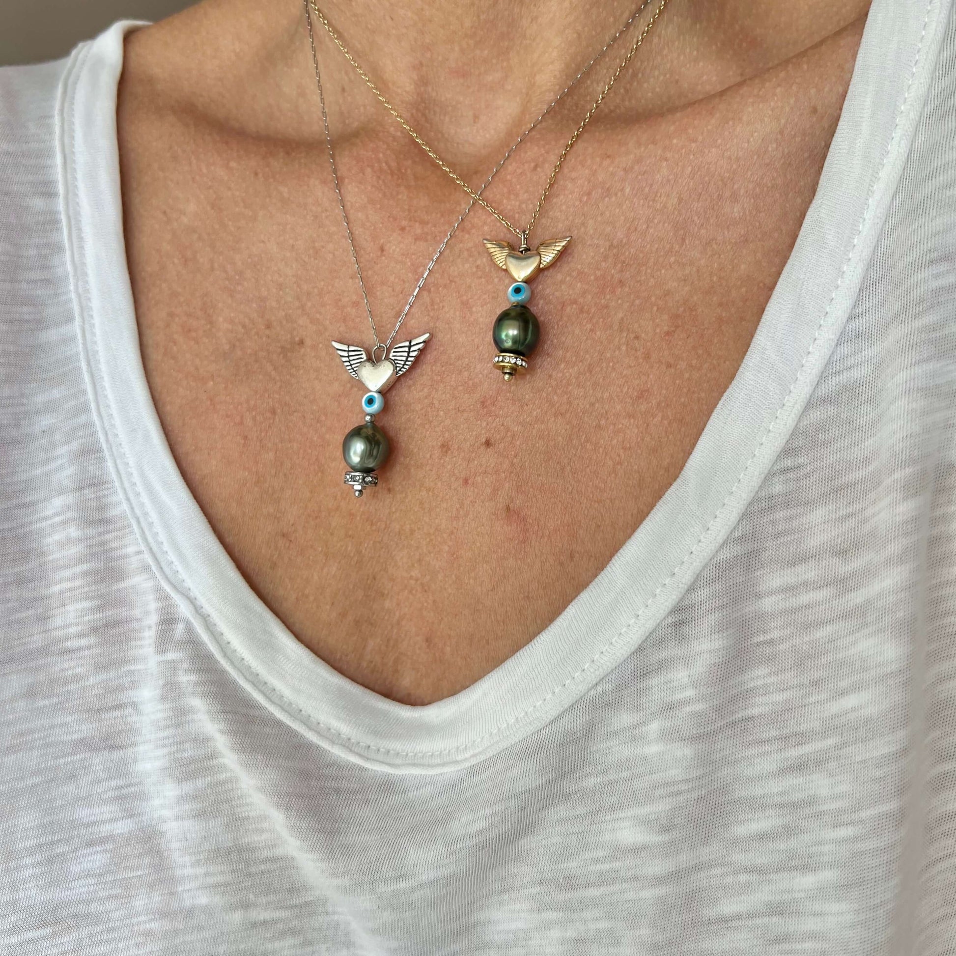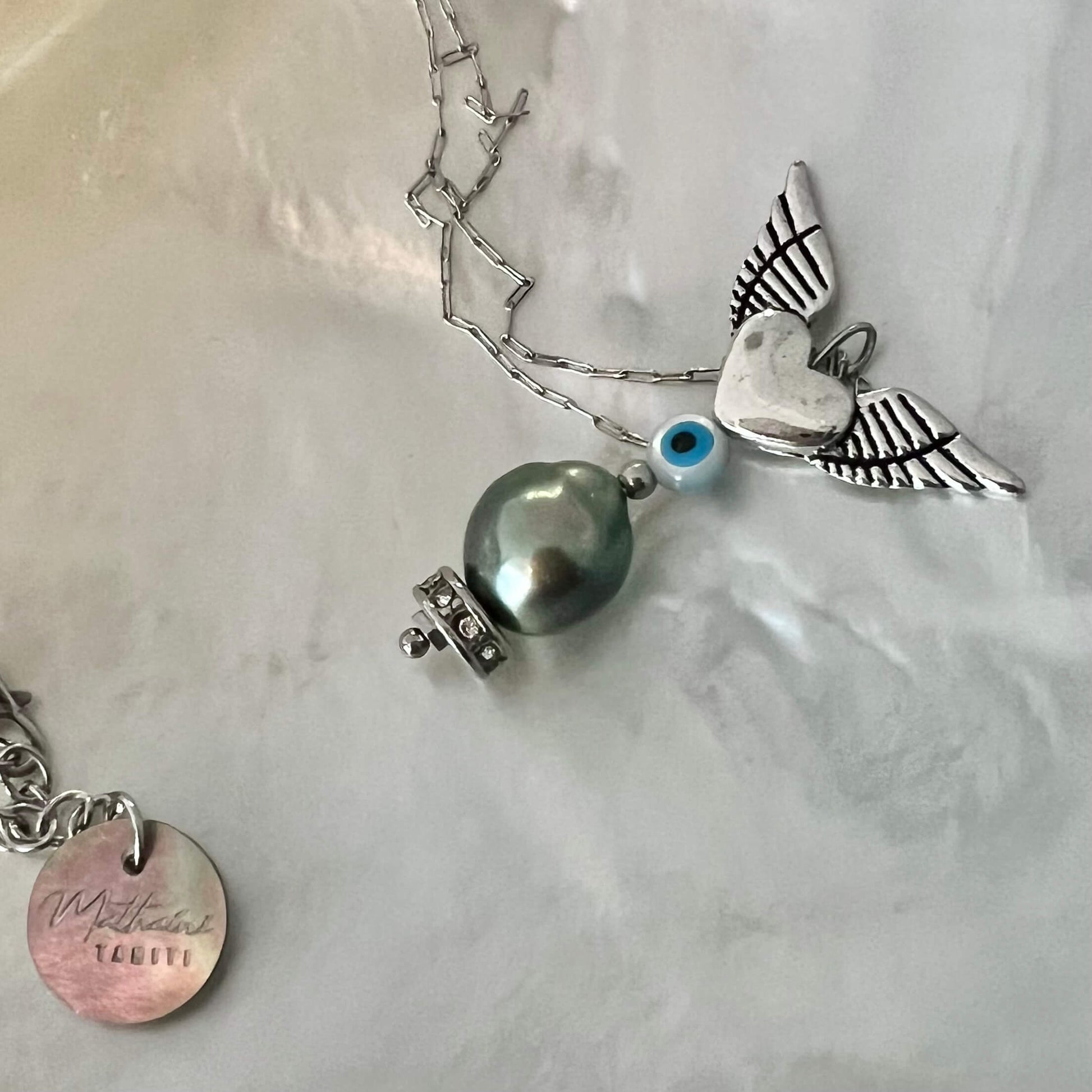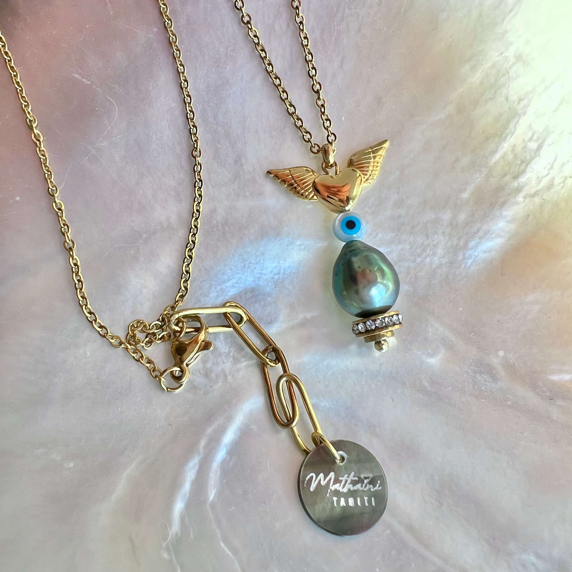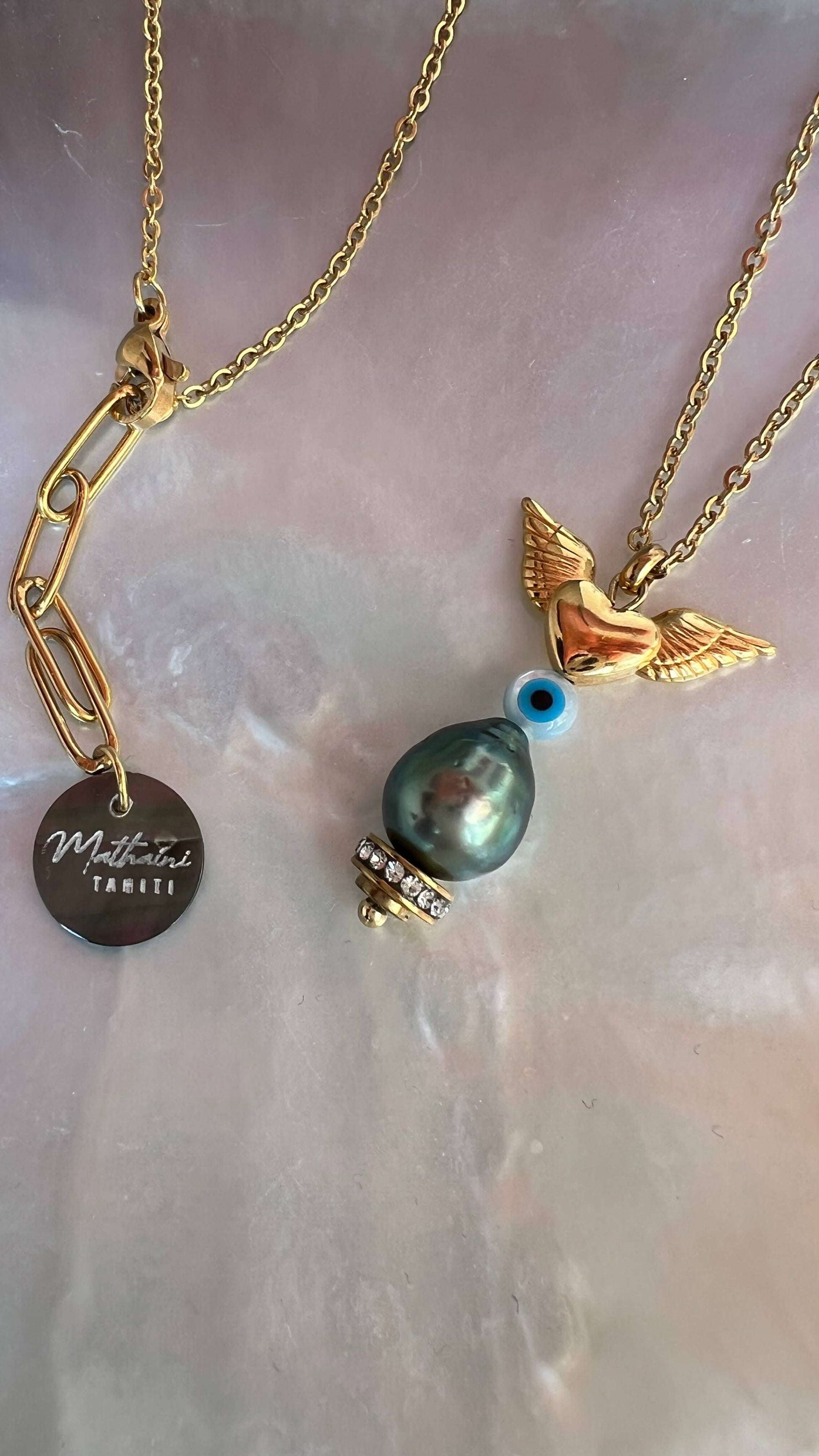 Collier Ra’Imere qui signifie l’ange du ciel en Tahitien. Offrez-vous un collier unique et plein de mystère avec notre collier RA'IMERE. Ses perles de Tahiti et ses ailes d'ange en font un porte-bonheur polynésien évoquant les anges célestes. Transformez votre look en un instant et attirez l'amour avec ce collier plein de magie.