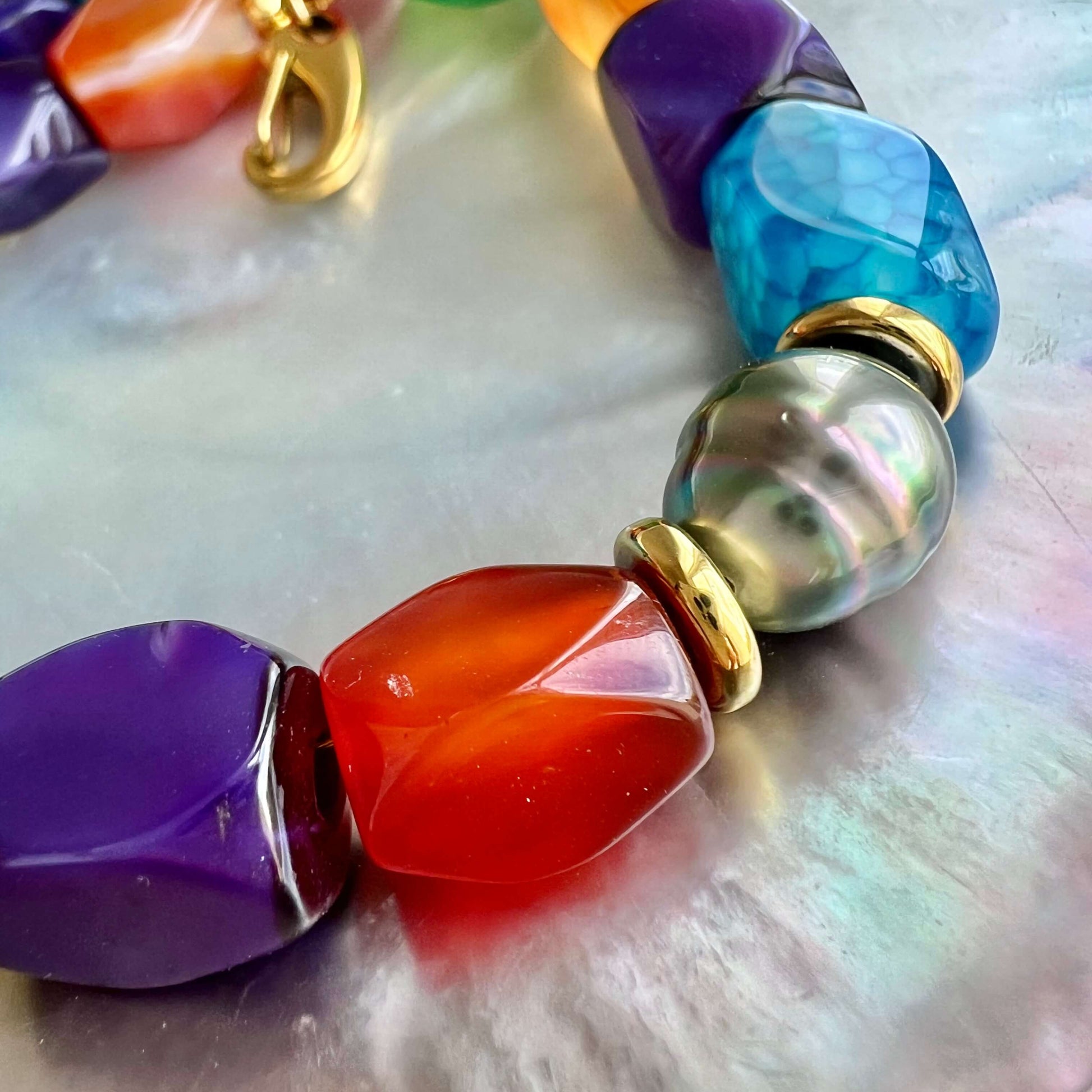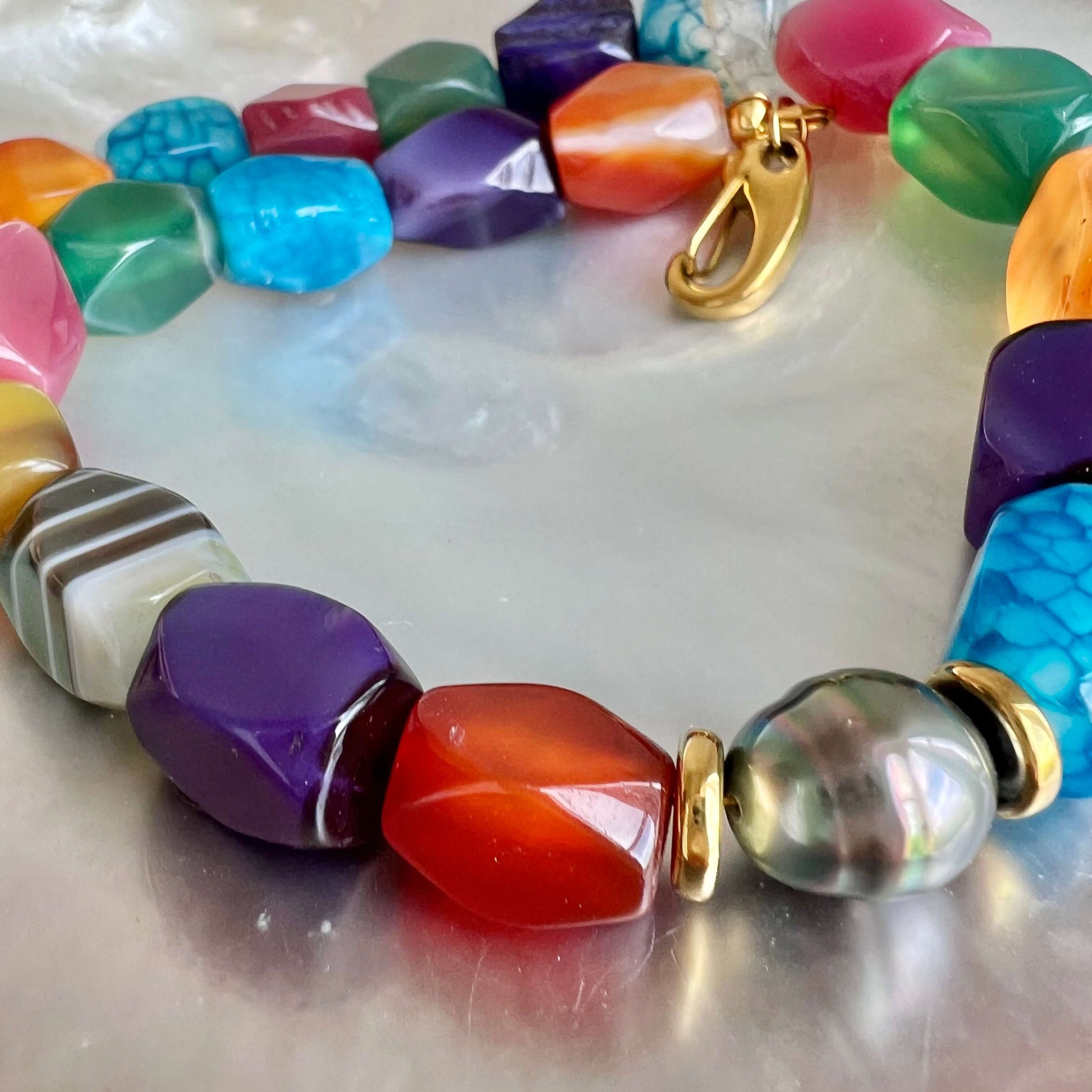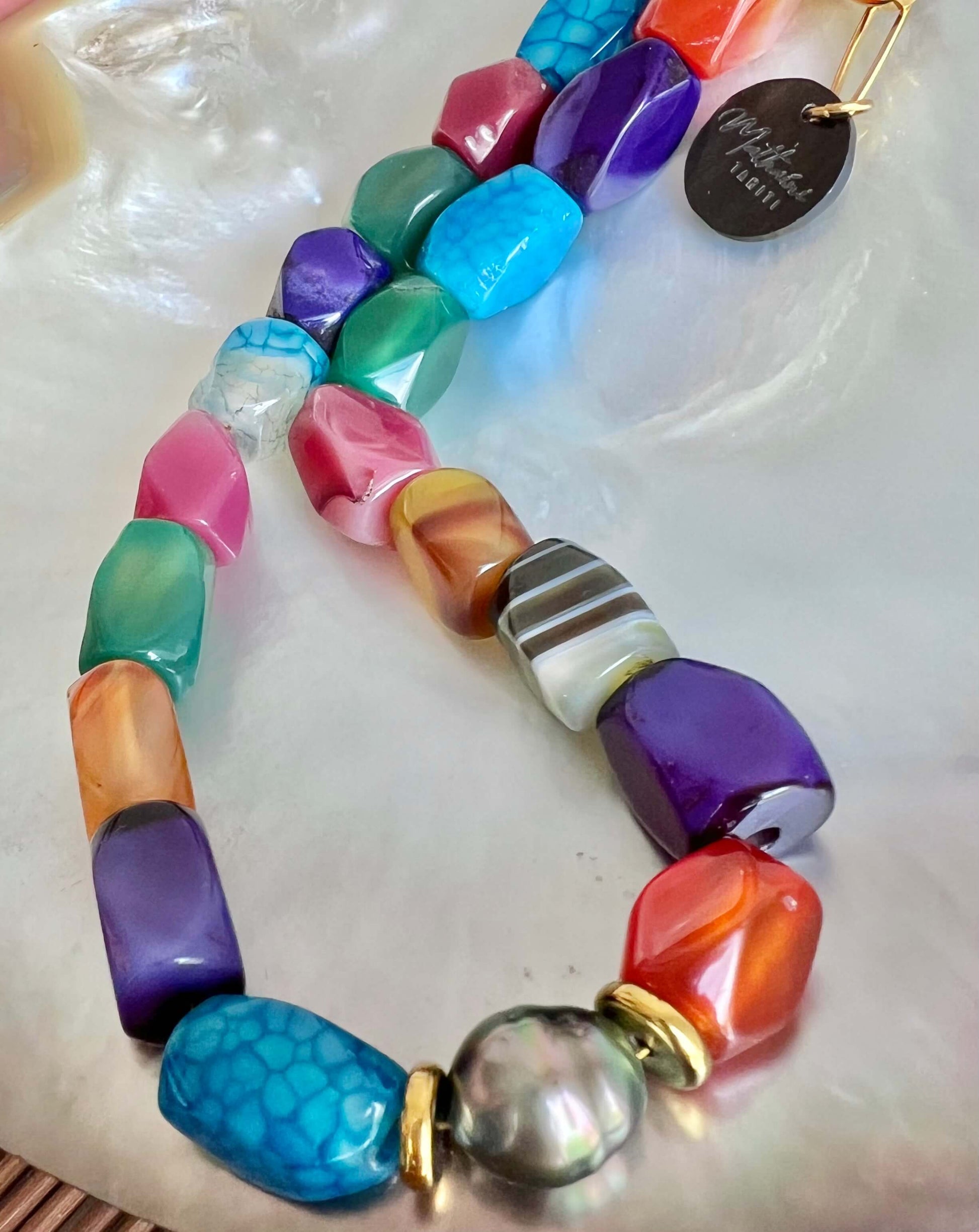 Ce collier majestueux ne recule devant aucun défi ! Agrémenté de pierres d'Agathe multicolores et d'une perle de Tahiti iridescente de 9mm, il ajoutera une touche audacieuse et unique à vos tenues. Découvrez votre côté aventurier avec cet accessoire qui rehaussera votre style avec éclat.