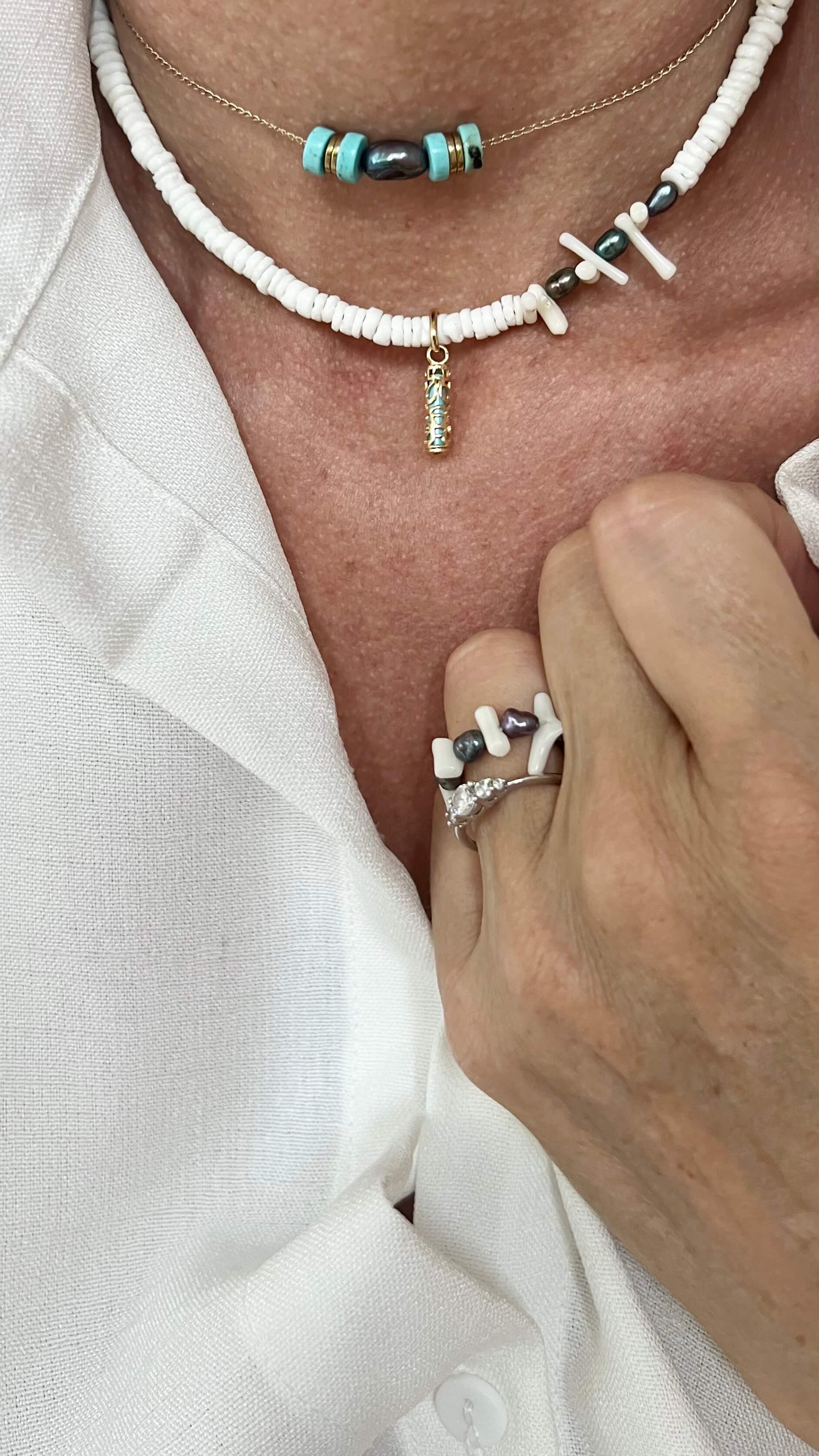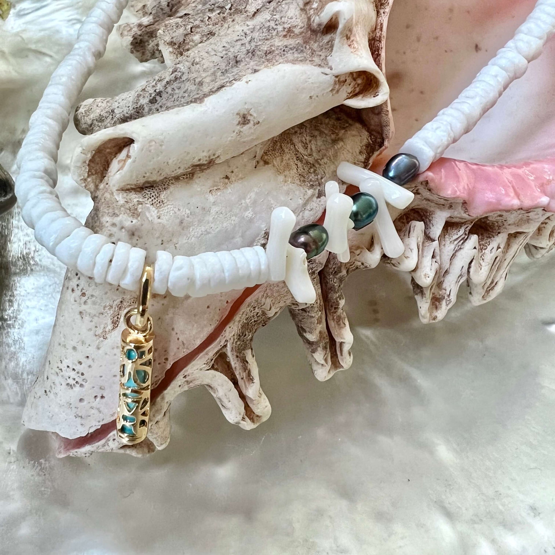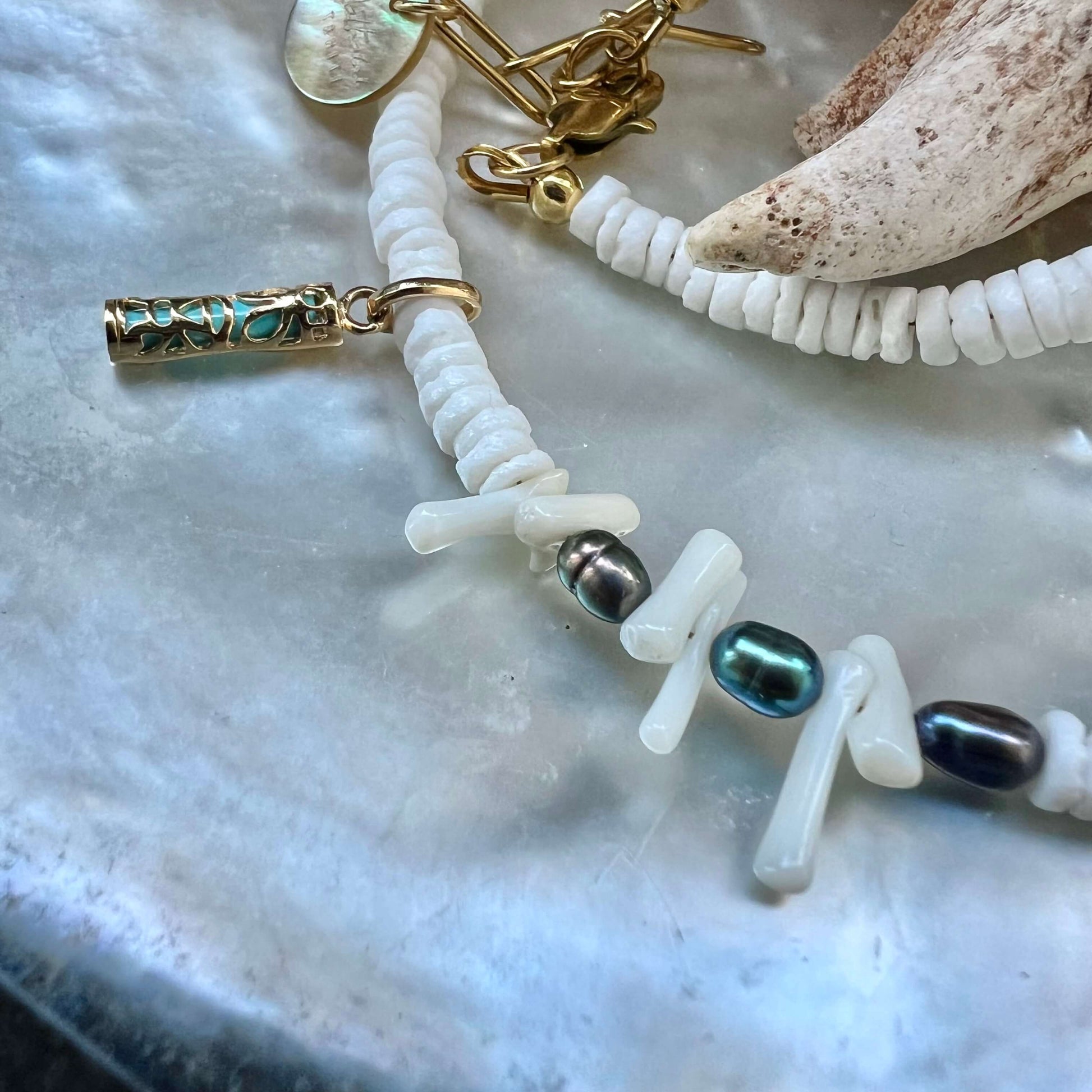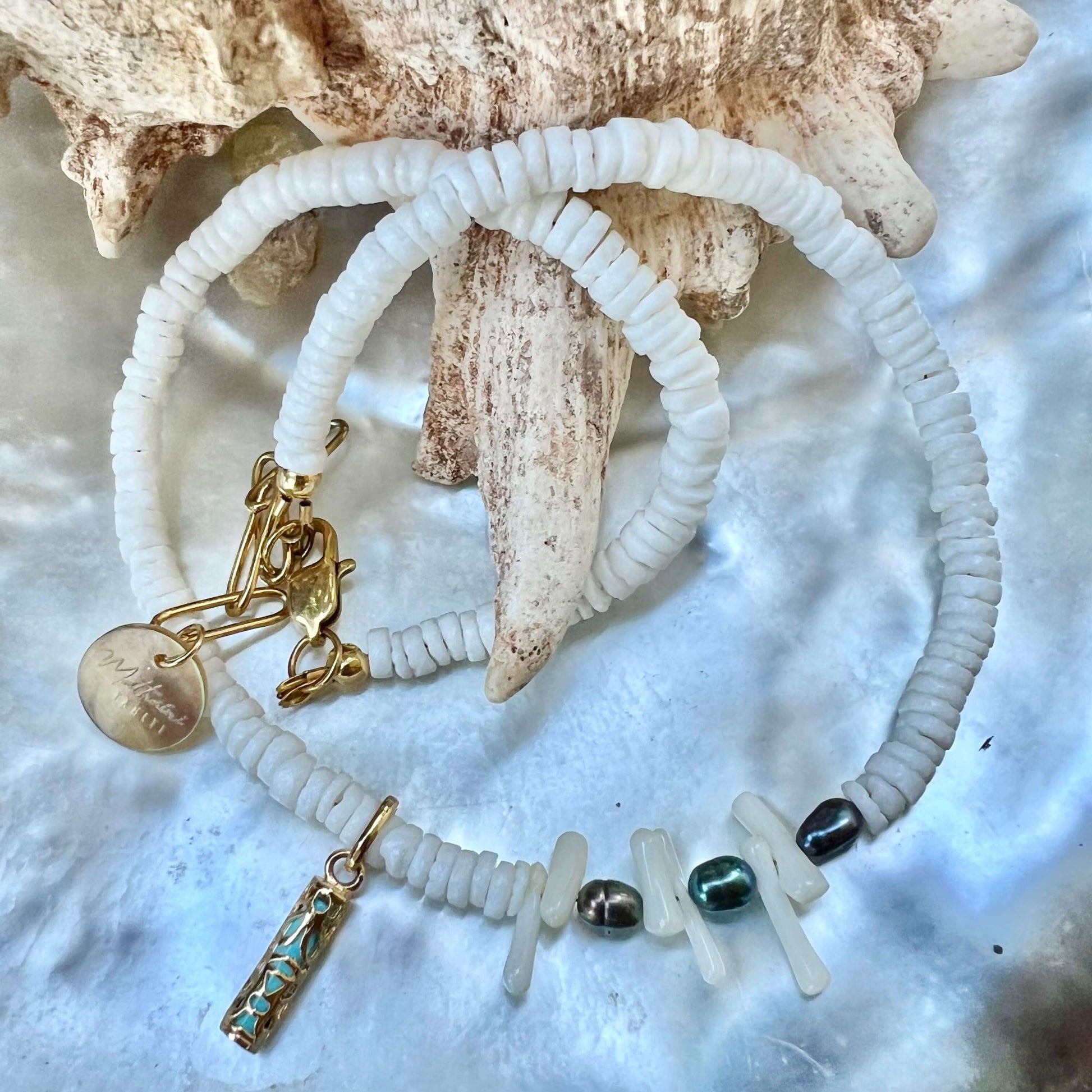 Composé de rondelle de coquillage communément appelé puka Shell que l’on trouve sur les plages du pacifique de keshis de Tahiti et d’un pendentif plaqué or tiki.