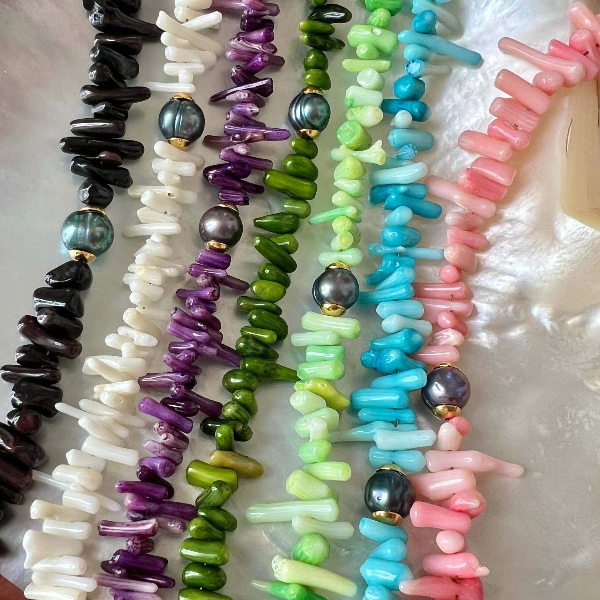 Collier 'ĀTIPI qui correspond à morceau de corail en Tahitien. Couleur au choix et perle de culture de Tahiti, taille de 6 à 7mm. Un collier estival qui donnera un petit coup de modernité accumulé à nos bijoux plus classique.