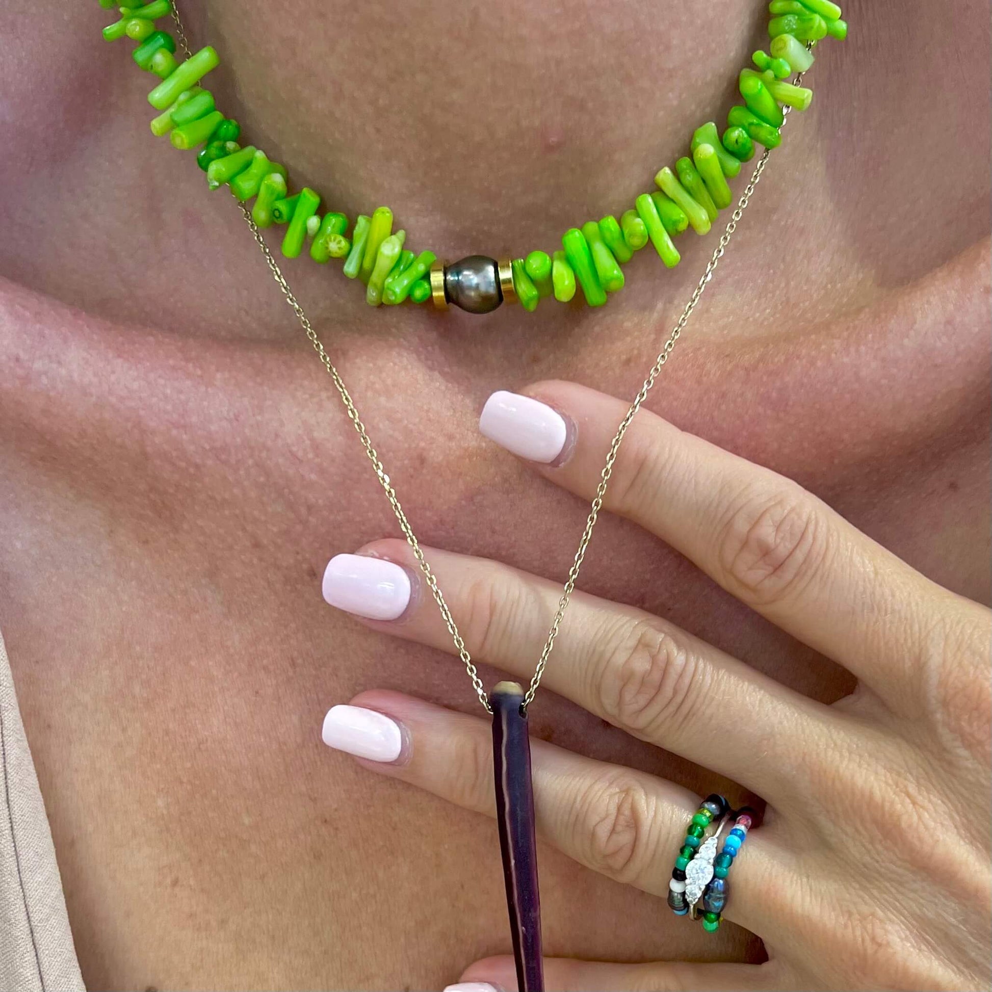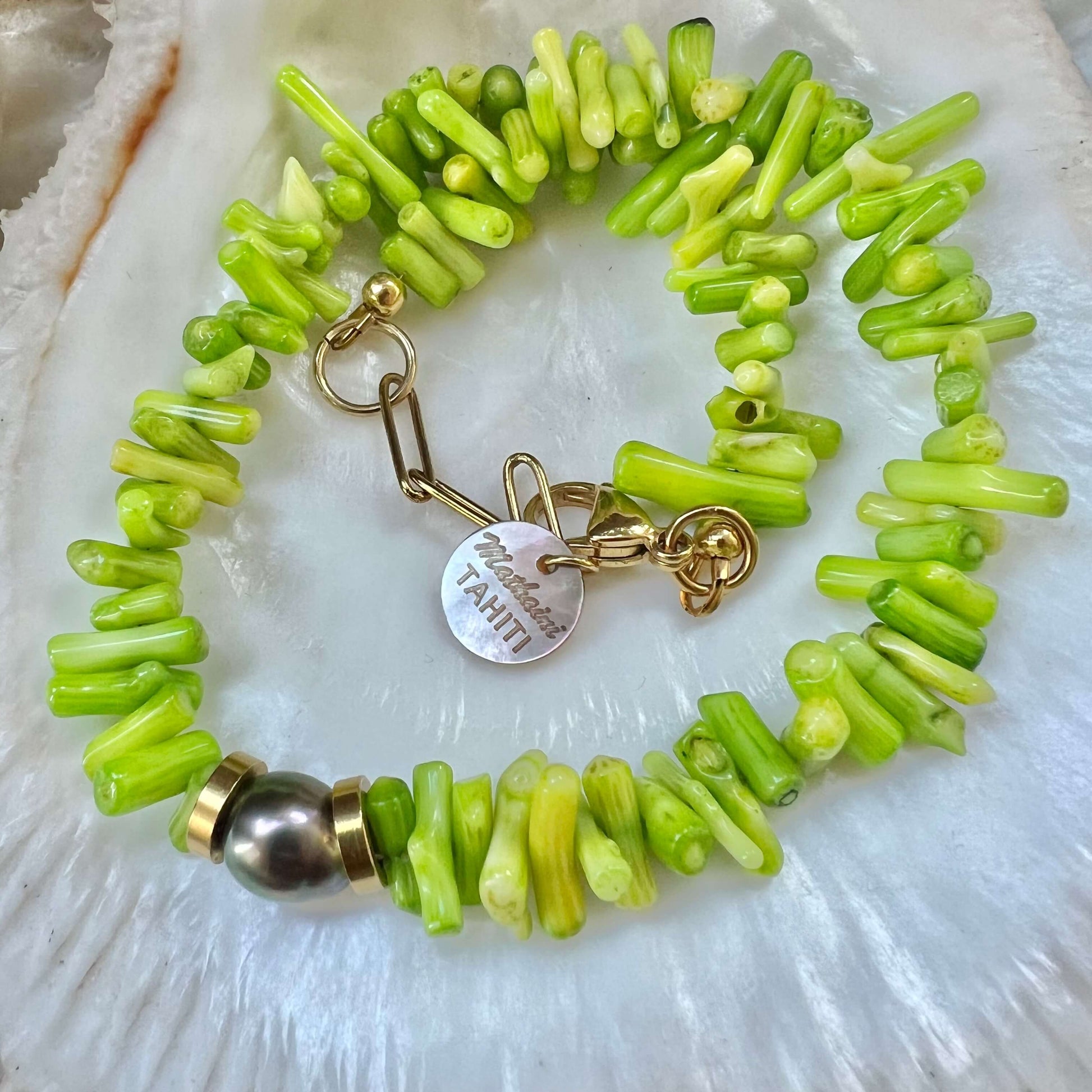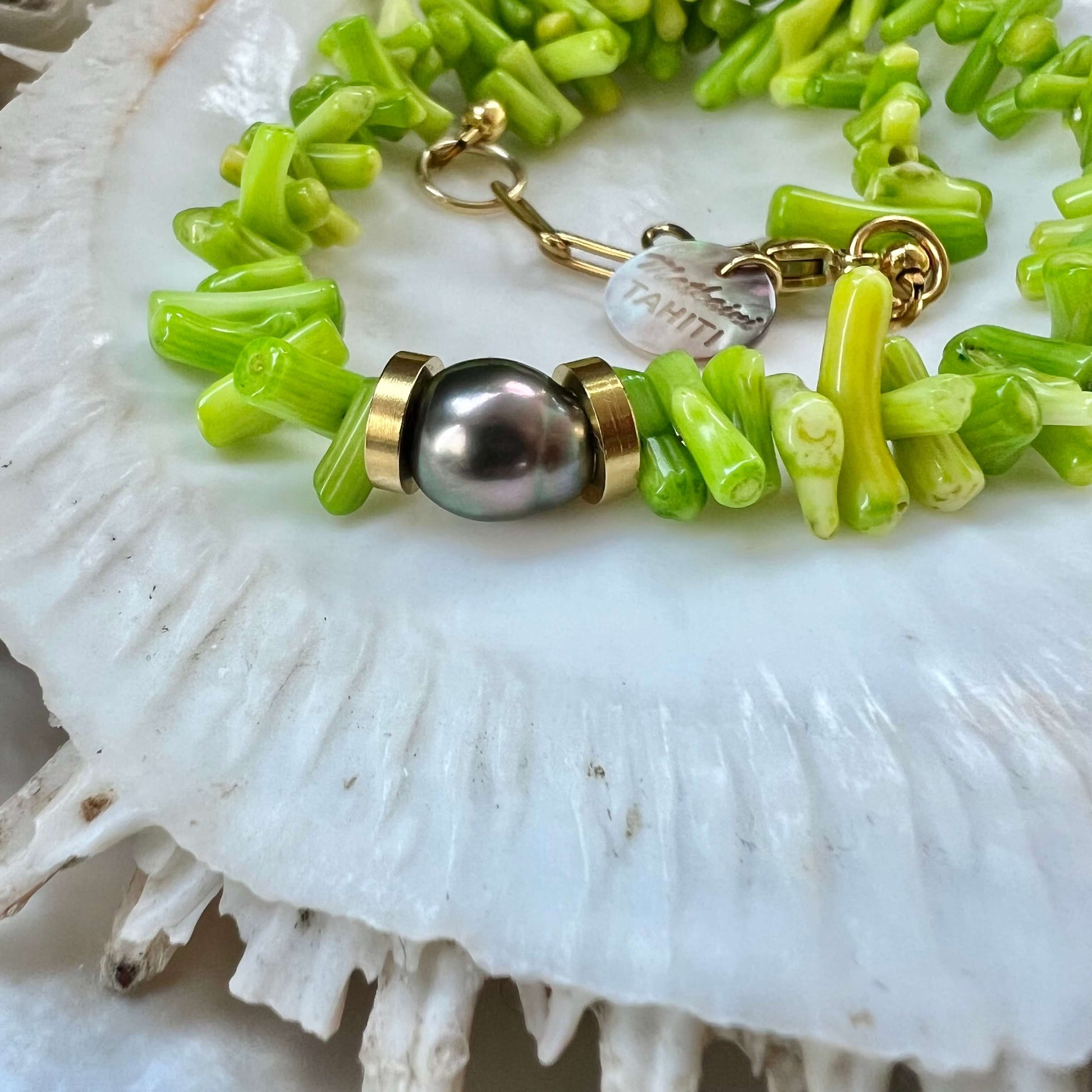 Collier FARERO qui est une espèce de corail branchu Tahitien. Perle de Tahiti de catégorie B aux reflets bleus lagons lustre très brillant associé au bambou de mer de différentes couleurs au choix.